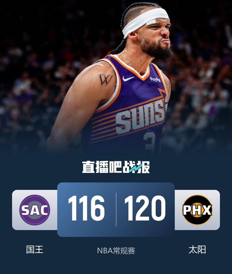 此役一上来双方稍显慢热,拉文和德罗赞逐渐找到感觉,蒙克替补登场发挥亮眼,国王不断发力领先10分结束首节,次节回来,两队拉开架势大打对攻,布克连造杀伤,但拉文火力全开独揽16分,国王延续状态拉开比分,半场战罢,国王确立17分优势。易边再战后布克里突外投率队追分,太阳不断打出小高潮蚕食分差,三节结束后国王仅领先2分,末节决战,国王进攻依然低迷,太阳一波11-2实现反超,德罗赞和施罗德及时止血,狄龙造犯规三罚全中,阿伦关键跳投打进,布克连中罚球后国王追分未果,最终太阳120-116逆转对手。