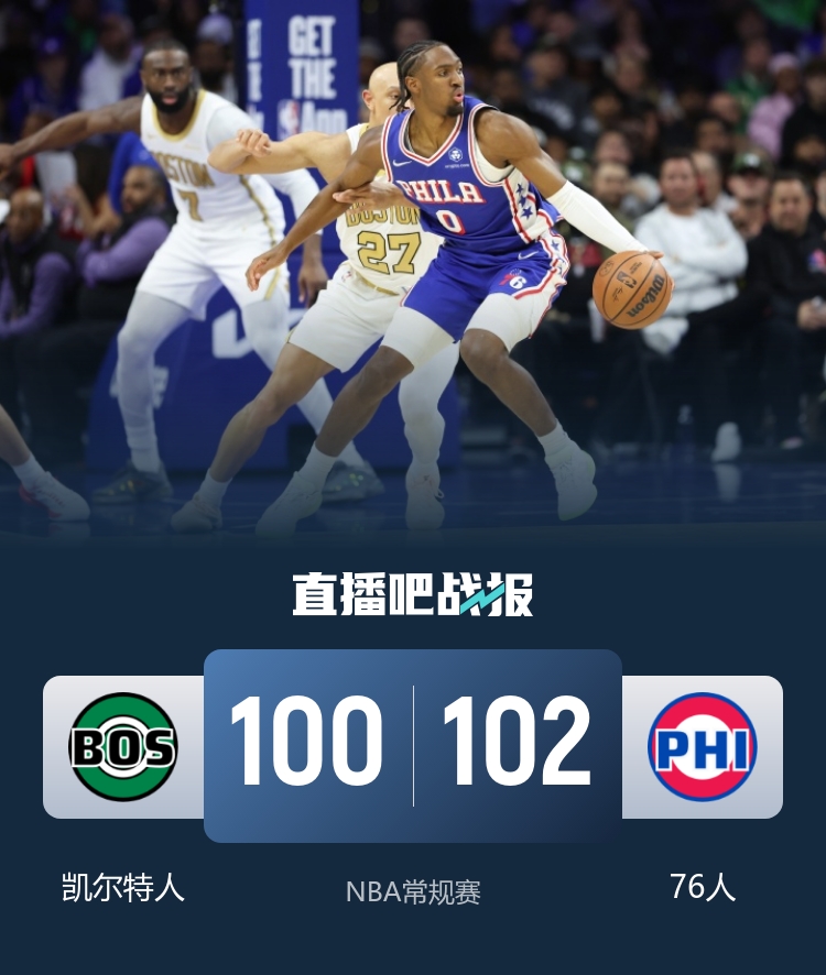 首节开打后凯尔特人首发手感冰凉,马克西找到节奏连续取分,凯尔特人替补及时回应,首节结束时76人领先1分,次节回来,凯尔特人进攻依然滞涩,德拉蒙德杀伤内线,76人稳扎稳打拉开比分,半场战罢,76人确立10分优势。易边再战后76人进攻突然断电,布朗突然爆发单节14分,凯尔特人一波13-2后来居上,格莱姆斯压哨三分止血,三节结束后凯尔特人反超6分,末节决战,爱德华兹神兵天降连续取分,76人轰出11-2制胜攻击波,决胜时刻布朗两罚中一,乌布雷关键补篮,怀特超远三分仓促出手未果,科塔极限补篮也未能打进,最终76人102-100险胜对手。