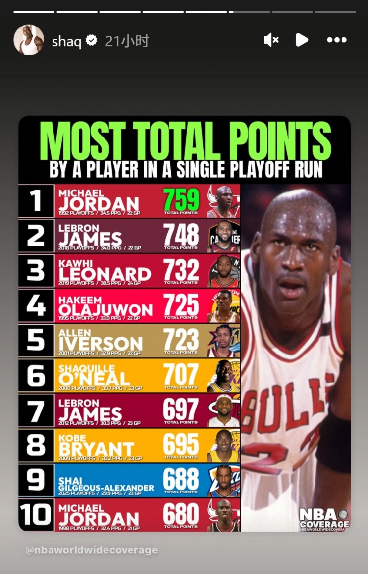 1、乔丹 1992年季后赛共得759分 场均34.5分(22场)