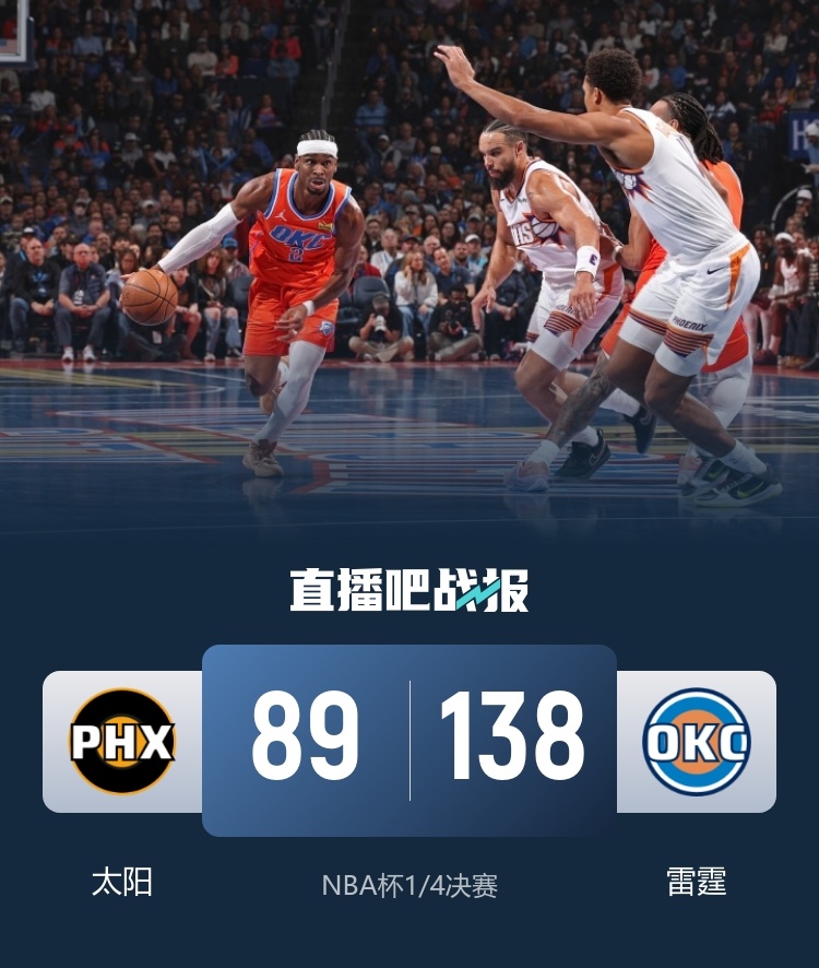 12月11日讯 NBA杯1/4决赛,雷霆今日迎战太阳,前者已经豪取15连胜,后者上场比赛则是战胜森林狼,此役布克和哈尔滕施泰因缺战。