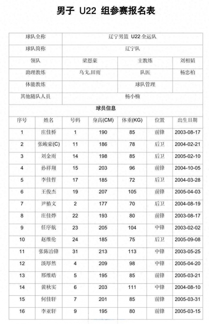 辽宁男篮U22全运队参赛报名表