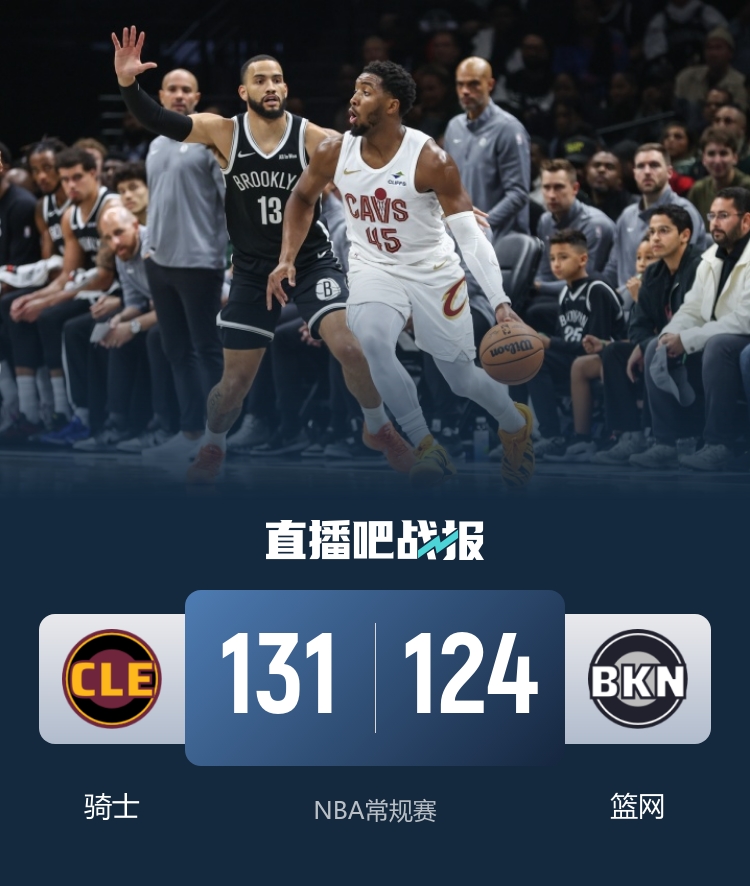 首节开打后骑士迅速发力,莫布里和阿伦肆虐内线,梅里尔连中三分,骑士一波9-0确立两位数优势,首节结束时骑士领先11分,次节回来,托马斯连投带罚率队追分,但骑士外线屡有斩获,两队分差一度来到20分,末段篮网及时止血,半场战罢,骑士依然领先12分。易边再战后骑士9-0打停对手,两队手感滚烫外线对飚,三节结束后骑士将优势扩大到22分,末节上来,篮网下起三分雨拉回悬念,阿伦连投带罚稳住局势,骑士连丢罚球但连续抢到前场板,梅里尔连中三分锁定胜局,最终骑士131-124险胜对手。