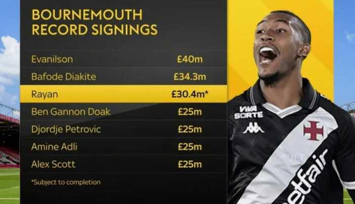 据此前多家媒体的报道,伯恩茅斯将签下瓦斯科达伽马19岁中锋拉扬,而天空体育表示转会费为3040万镑。该媒体也统计了伯恩茅斯队史引援...